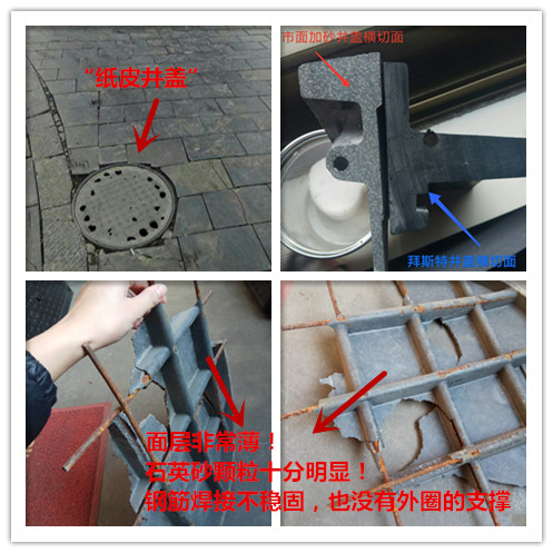 井蓋與井蓋之間大有不同,現(xiàn)在很多井蓋廠家為了降低成本,在井蓋里面加上石英砂,石英砂一種很便宜的沙料,它的吸水率很大,石英砂與樹脂在融合的過程中容易產(chǎn)生縫隙,在下雨或者下雪的時(shí)候容易進(jìn)入水蒸氣,冬天凍住,夏天化開,這樣就使井蓋內(nèi)部的間隙就越來越大,再加上車輛來回碾壓,就更加容易裂開,井蓋上就會(huì)出現(xiàn)一個(gè)個(gè)孔,“紙皮井蓋”就是這樣來的。