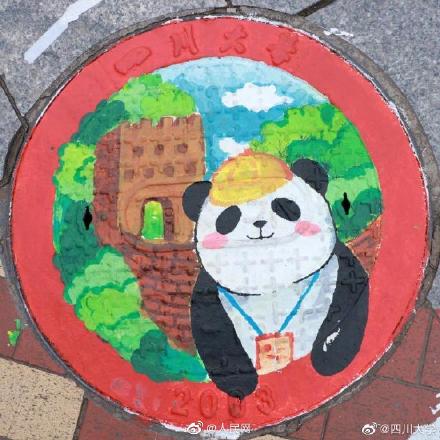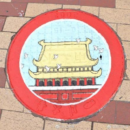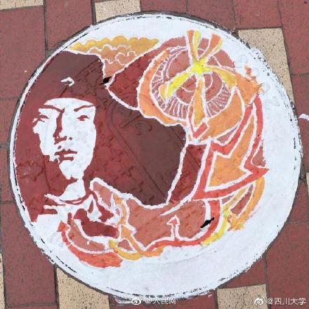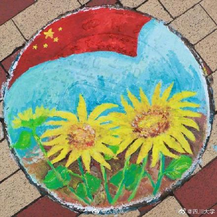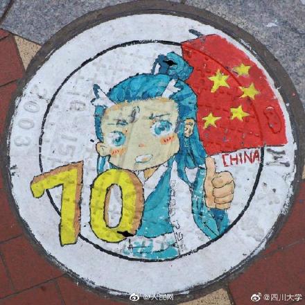 四川大學的同學們花式表白祖國,用中國京劇、中國航天、中國高鐵、萬里長城、大熊貓、卡通敖丙等元素與新中國成立70周年的創(chuàng)意結(jié)合,以井蓋為畫布,用水粉作畫,以色彩和圖案將井蓋變成一道亮麗的風景線,這表白杠杠的!